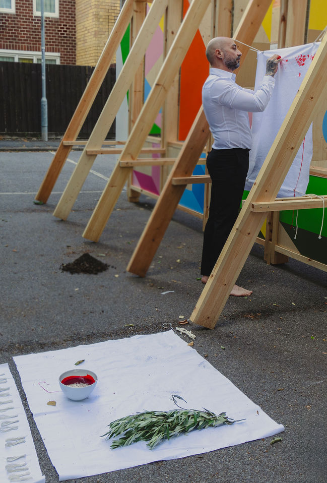 As part of the Dalston Pavilion Public Programme, I created a performance that was a visceral exploration of displacement and identity. Through a stark and symbolic act, I wove threads dipped in fake blood into a white canvas, then flagellated it with olive tree branches also dipped in fake blood. This powerful and disturbing visual metaphor conveyed my harrowing experience of fleeing the war in Syria and the subsequent struggle to find belonging in a new land. The piece culminated in the planting of an olive tree branch in soil and its symbolic "watering" with blood. This final act represented my hope for resilience, growth, and a future rooted in peace and belonging.